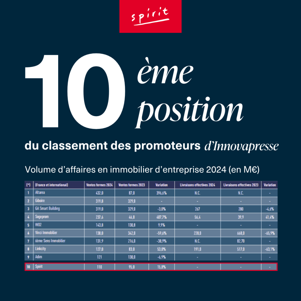Nous sommes fiers d’annoncer que SPIRIT ENTREPRISES se hisse parmi les 10 premiers promoteurs en immobilier d’entreprise, grâce à notre volume d’affaires.
